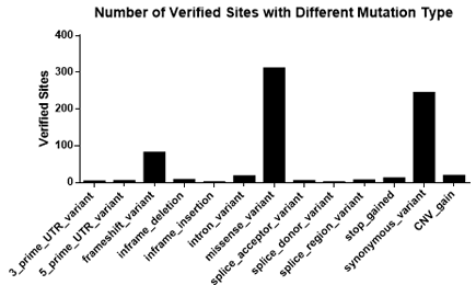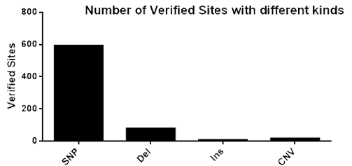 表1. 泛腫瘤相關(guān)靶向基因部分展示 3. 染色體全覆蓋,除了Y染色體外,其他染色體都有涉及; 圖1. 在不同染色體編號上的位點(diǎn)數(經(jīng)過(guò)驗證的位點(diǎn)) 4. 變異種類(lèi)多:涉及SNP,deletion,insertion,CNV等等; 圖2. 不同種類(lèi)突變形式的位點(diǎn)數(經(jīng)過(guò)驗證的位點(diǎn)) 5. 突變頻率全覆蓋,從1%-100%,各區間都有涉及; 圖3. 不同突變頻率的位點(diǎn)數(經(jīng)過(guò)驗證的位點(diǎn)) 6. 突變類(lèi)型全覆蓋,有UTR區域,有內含子,有外顯子,有錯義突變,有同義突變,有供體變異等等; 圖4. 突變細分種類(lèi)的位點(diǎn)數(經(jīng)過(guò)驗證的位點(diǎn)) 7. 位點(diǎn)多,超過(guò)680個(gè)位點(diǎn),全部有對應的Cosmic ID或/和dbSNP ID注釋?zhuān)?/span> 圖5. 經(jīng)過(guò)dbSNP ID和Cosmic ID注釋的位點(diǎn)數(經(jīng)過(guò)驗證的位點(diǎn)) 8. 多平臺驗證,數據準確可信賴(lài); 8.1 其中1000x panel驗證16個(gè)位點(diǎn),panel為知名商業(yè)化公司產(chǎn)品; 表2. 16個(gè)經(jīng)過(guò)1000x NGS-Panel試劑盒驗證的位點(diǎn)信息 8.2 DdPCR驗證8個(gè)位點(diǎn),Bio-Rad QX200和Bio-Rad原裝試劑 表3. 8個(gè)經(jīng)過(guò)DdPCR(bio-rad)試劑盒驗證的位點(diǎn)信息 8.3 500X WES驗證所有位點(diǎn),IDT xGenExome Research Panel v1.0捕獲,HiSeq X-TEN測序 表4. 500X WES驗證的400個(gè)基因信息 9. 基因覆蓋科學(xué),超過(guò)400個(gè)基因,覆蓋國內外多個(gè)知名panel的設計; 表5. 基因覆蓋率比較 免費試用活動(dòng)開(kāi)始了,感興趣的親們可以聯(lián)系我們4008-750-250 |