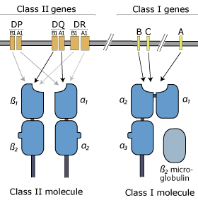 II類(lèi)區域對應 HLA-DR、-DQ和 -DP基因等,編碼 α 鏈基因 (A1) 和 β 鏈基因 (B1)。α鏈和 β鏈配對形成功能性HLA分子。大多數個(gè)體攜帶額外的DRB基因 (DRB3 或 DRB4 或 DRB5),該基因編碼可能與α鏈配對的不同β鏈。