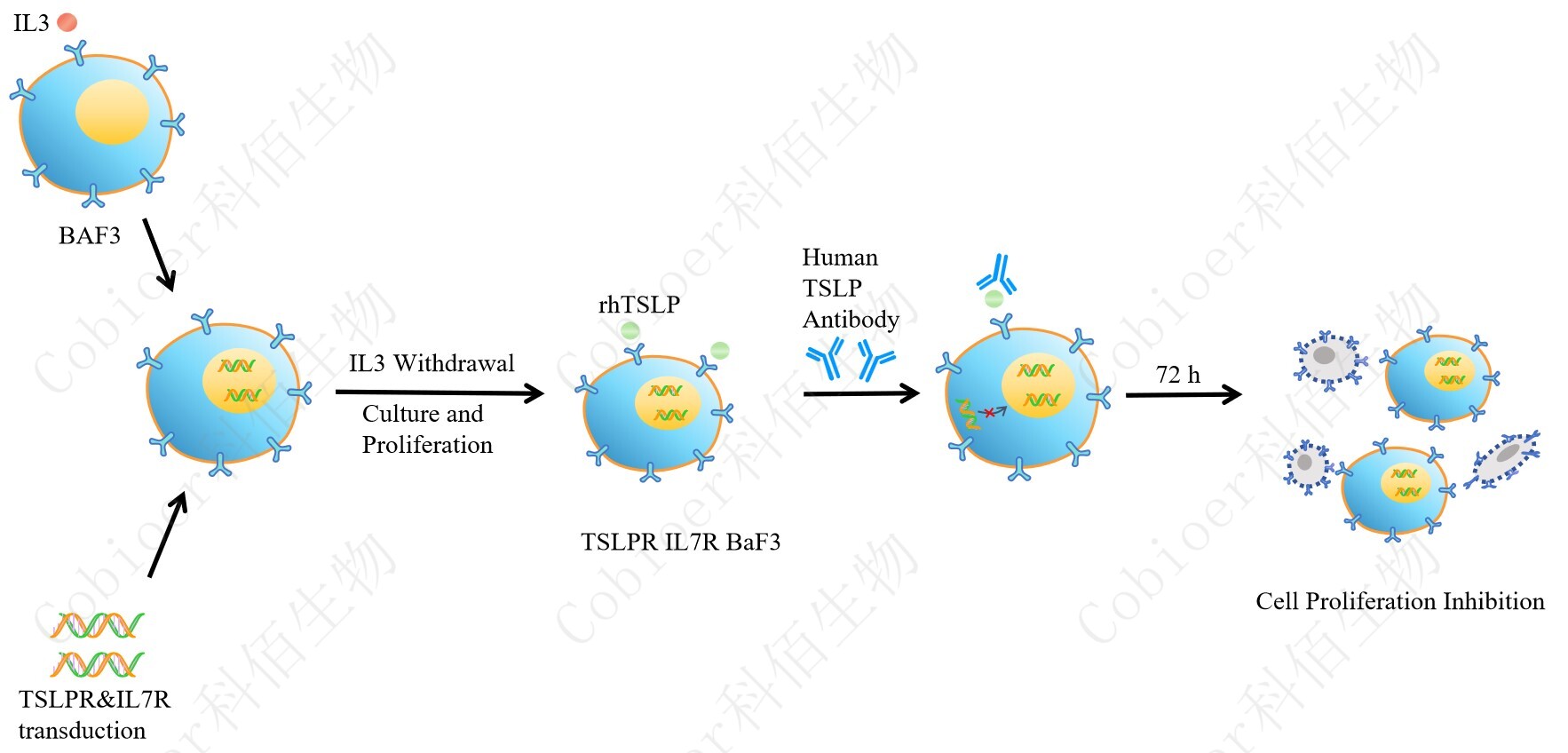 BaF3(小鼠原 B 細胞)的生長(cháng)和增殖需要 IL-3 的維持。通過(guò)引入各種表達激酶的基因, 能作為 BaF3 的驅動(dòng)基因,讓 BaF3 不再依賴(lài) IL-3 而增殖,進(jìn)而激酶基因成為 BaF3 增殖依賴(lài)的驅動(dòng)基因,用于評估小分子藥物對激酶的靶向抑制作用,原理及流程見(jiàn)下圖所示。![]() Figure 1. TSLPR IL7R BaF3 細胞模型原理圖 |