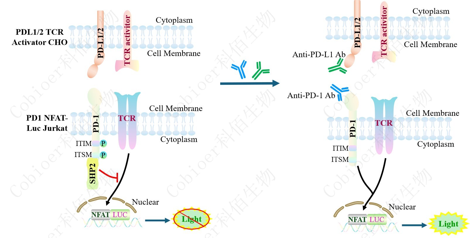 PD1 NFAT-Luc Jurkat 報告基因藥靶模型很好的模擬了體內 PD1&PDL1/PDL2 的信號轉 導過(guò)程,原理見(jiàn)下圖所示。
