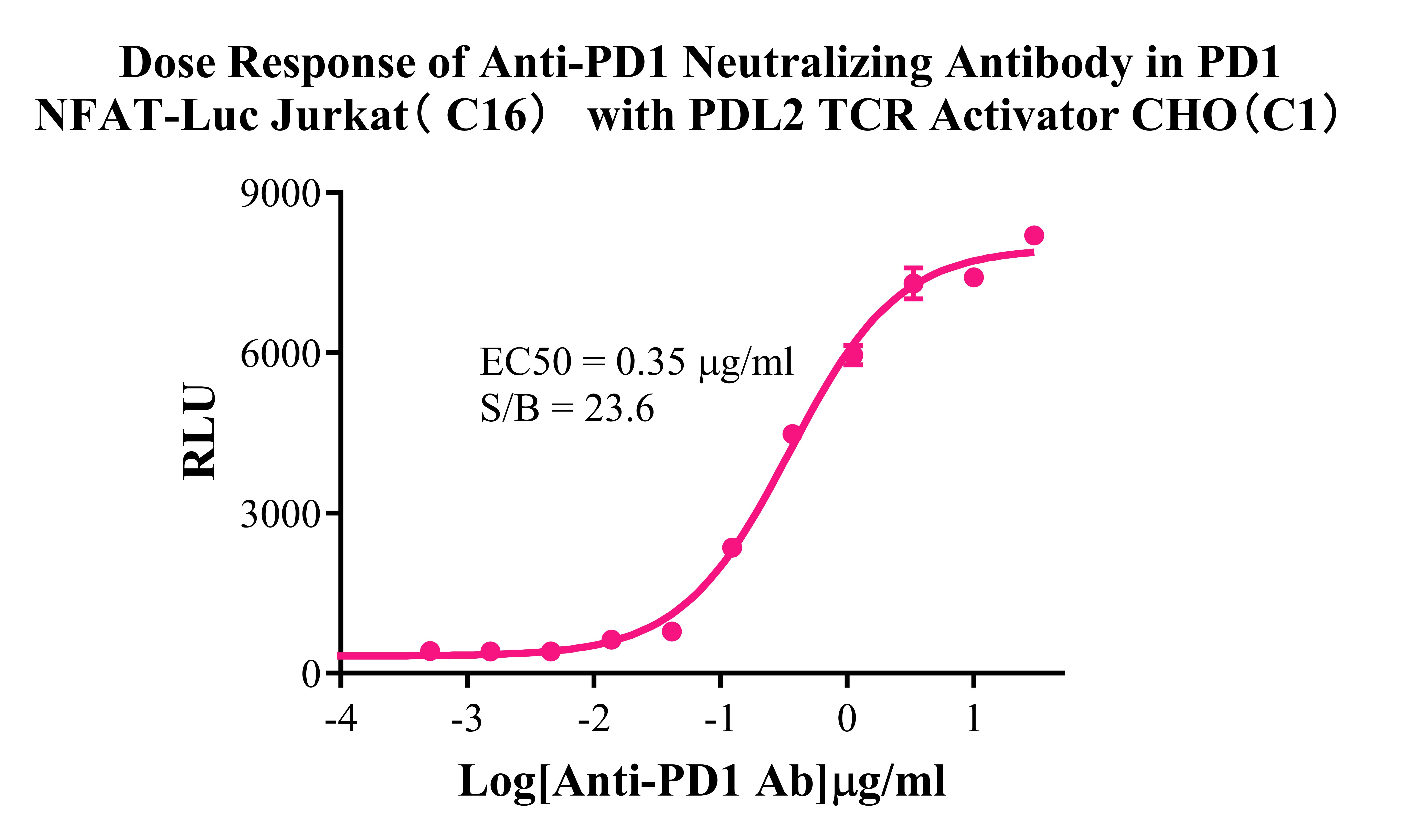 Figure 3. Detect Luciferase assay by Ultra Luciferase Detection Kit CBPH0001(we strongly suggest to purchase from Cobioer).Dose response of Anti-PD-1 Neutralizing Antibody in PD1 NFAT-Luc Jurkat(C16) with  PDL1 TCR Activator CHO (C5).