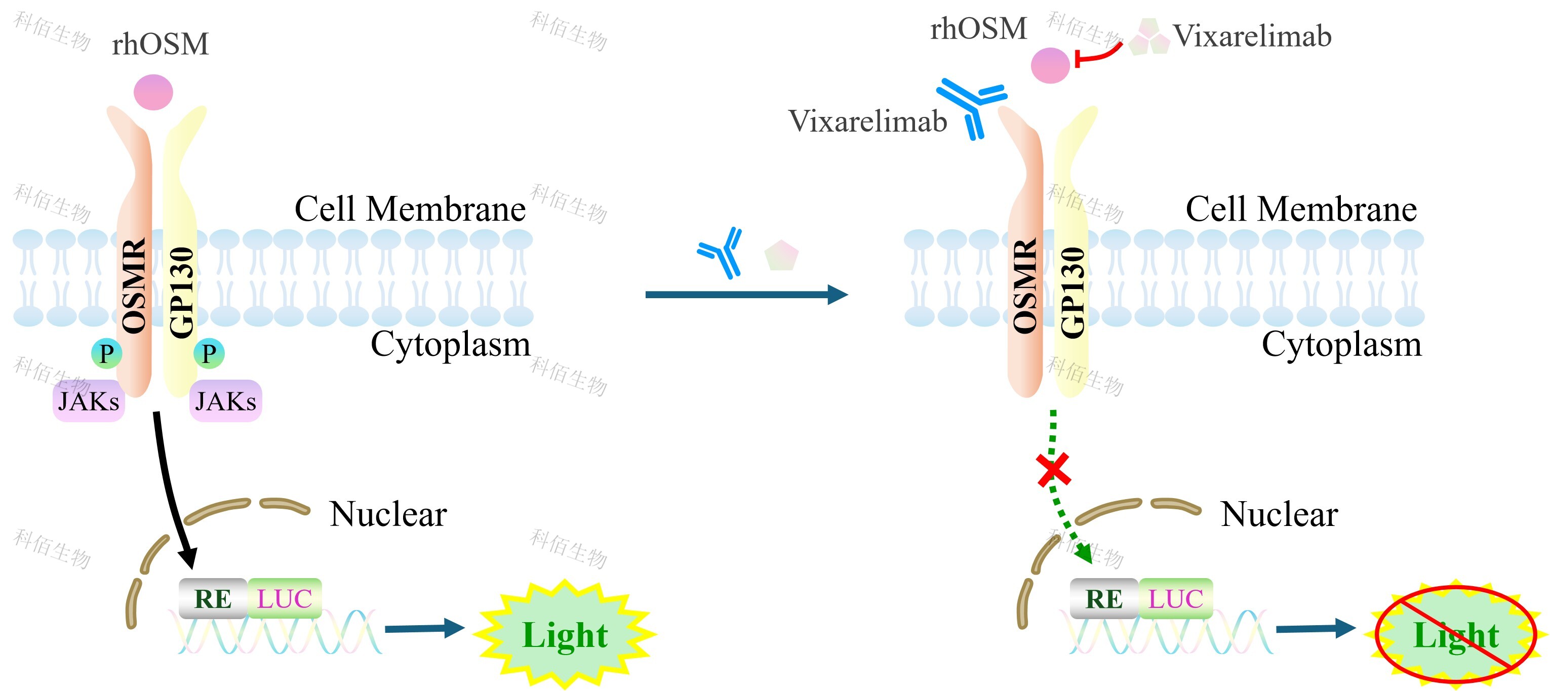 OSMR Effector Reporter Cell 報告基因藥靶模型很好的模擬了體內(nèi) OSMR 的信號轉(zhuǎn)導過程,原理見圖所示。
