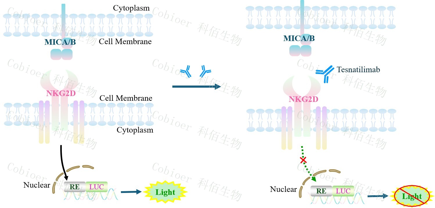 NKG2D Effector Reporter Cell 報告基因藥靶模型很好的模擬了體內 NKG2D 的信號轉導過(guò)程,原理見(jiàn)下圖所示。