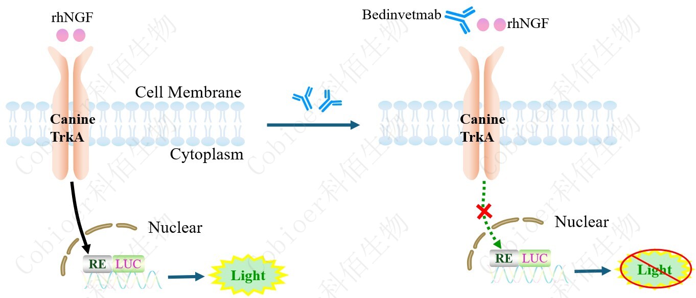 NGF/Canine TRKA Effector Reporter Cell 報告基因藥靶模型很好的模擬了體內 NGF/Canine TRKA 的信號轉導過(guò)程,原理見(jiàn)下圖所示。
