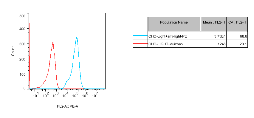 Figure. Recombinant stable clonal CHO cell line constitutively expressing full length human LIGHT protein, also known as TNFSF14, (Genbank #NM_003807). Surface expression is confirmed by flow cytometry.