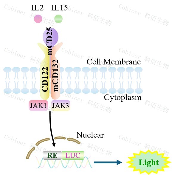 Figure 1. hIL2/IL15(mCD25 hCD122 mCD132)Effector Reporter Cell 細胞模型原理圖