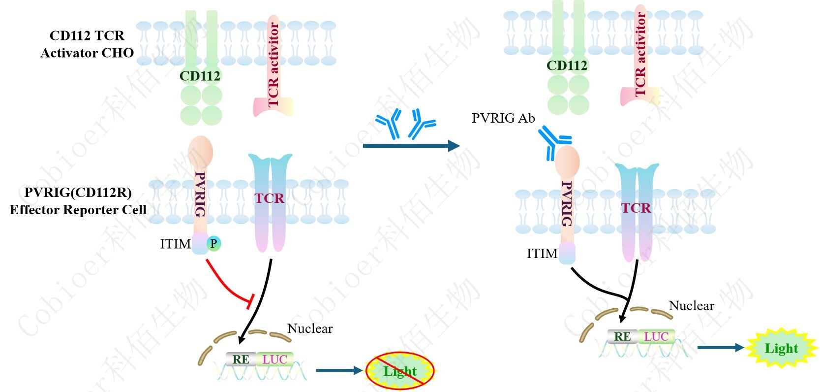 PVRIG(CD112R) Effector Reporter Cell 報告基因藥靶模型很好的模擬了體內 PVRIG 的 信號轉導過(guò)程,原理見(jiàn)下圖所示。