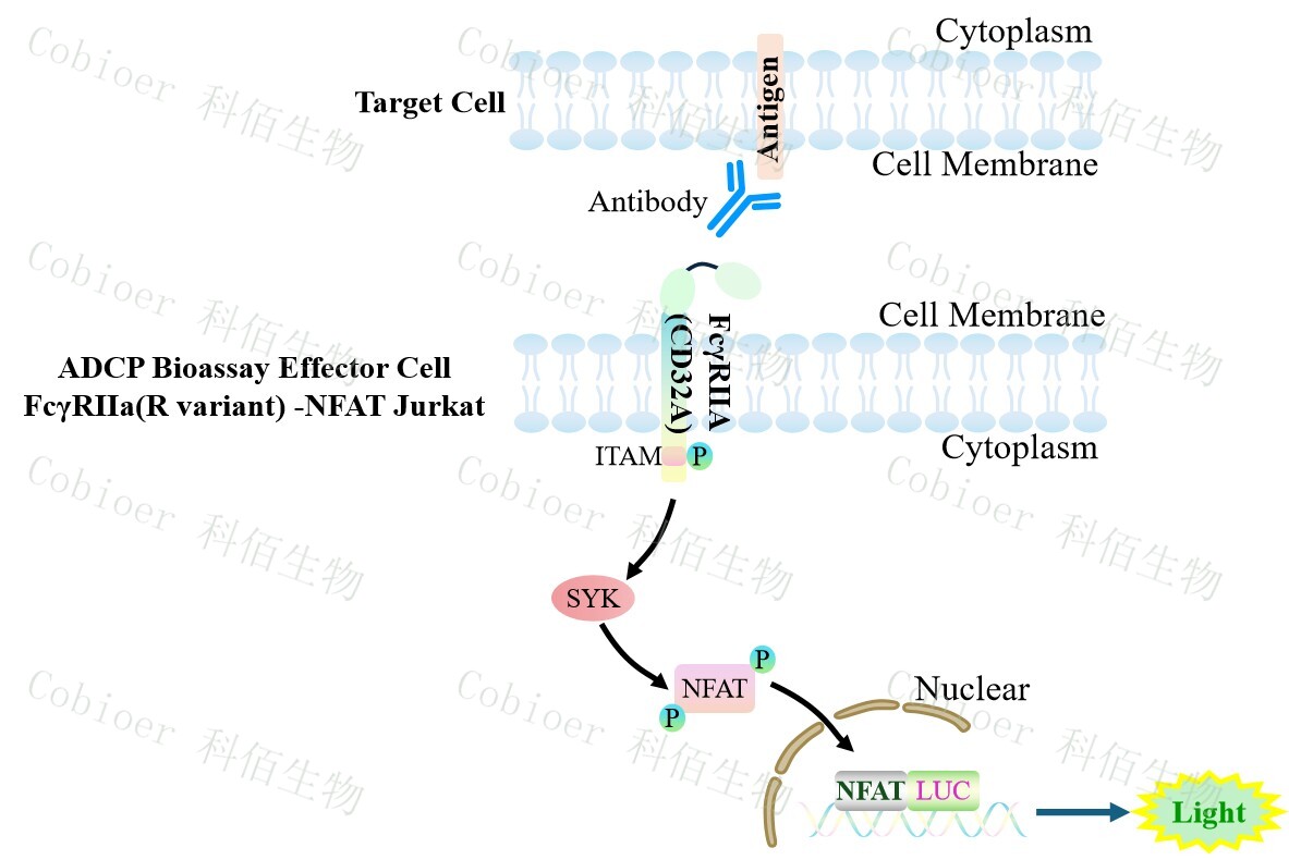 ADCP Bioassay Effector Cell FcγRIIa(R variant) -NFAT Jurkat 報告基因藥靶模型很好的 模擬了體內 ADCP 的信號轉導過(guò)程,原理見(jiàn)下圖所示。