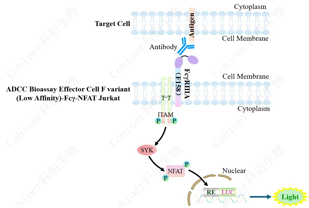 Figure  1. ADCC Bioassay Effector Cell F variant (Low Affinity)-Fcγ-NFAT Jurkat 細胞模型原理圖