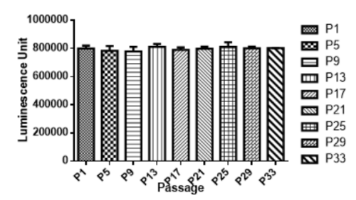 Figure. Stablity test results. Glioma261-Luc cells showed at least 32 passage stability with similar luminescence unit.