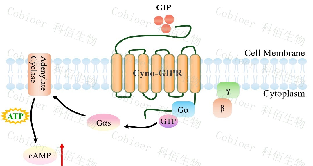 cAMP 在 G 蛋白偶聯(lián)受體(GPCR)信號轉導中是一種關(guān)鍵的第二信使。當配體結合到 GPCR,構象發(fā)生變化,激活受體接著(zhù)激活G蛋白,Gs的激活導致腺苷酸環(huán)化酶調控cAMP 的升高。GIPR 藥靶模型很好的模擬了體內 GIPR 的信號轉導過(guò)程,原理見(jiàn)下圖所示。