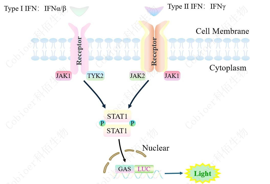 GAS-Luc THP-1 報告基因細胞,是由 GAS 調控并表達 Luc 熒光素酶報告基因的 THP-1 細胞。IFN 與受體結合,激活 GAS 的原理見(jiàn)下圖所示。