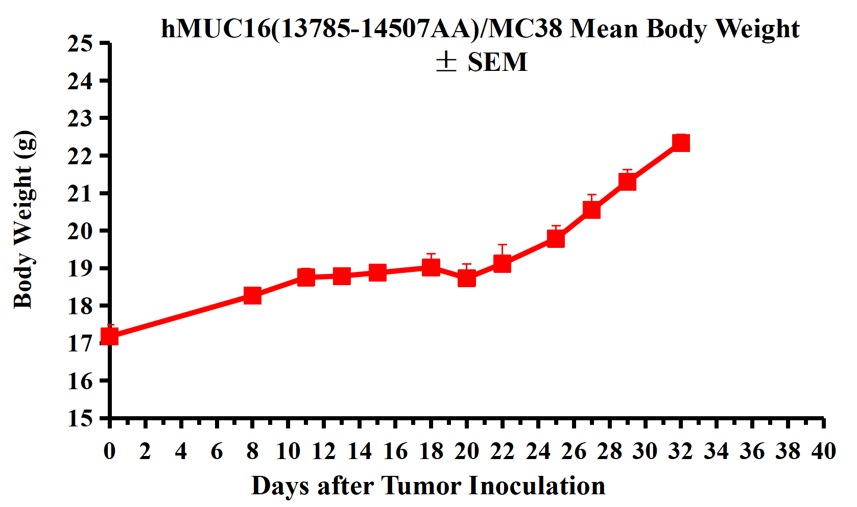 hMUC16(13785-14507AA)/MC38 Mean Body Weight ± SEM.