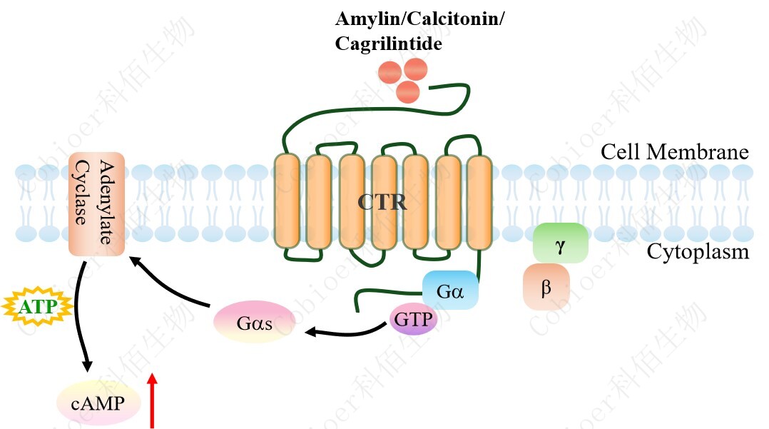 胰淀素(Amylin)受體的三種類(lèi)型的已被確定,即 AMY1,AMY2 和 AMY3。胰淀素 受體屬于 B 類(lèi) GPCR,是異二聚體復合物,由降鈣素受體(CTR)與受體活性修飾蛋白 (RAMPs)結合形成。該受體的 CTR 組分具有相同的 GPCR 結構:7 個(gè)跨膜相互連接的α-螺 旋,將細胞外信號傳遞到細胞內細胞質(zhì)信號級聯(lián)。RAMP 有三種類(lèi)型(RAMP1、RAMP2 和 RAMP3),它們共享 31%的氨基酸序列,具有相似的基本結構。RAMP 是將 CTR 轉運到細 胞膜并調節其配體特異性的重要肽,它可以改變特定 GPCR 的藥理學(xué)、功能和細胞運輸。
