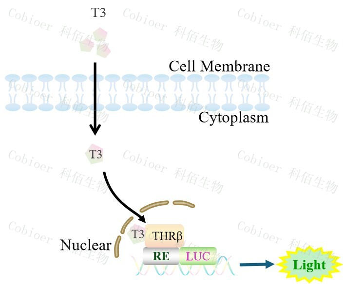 THRB Luciferase Reporter HEK293,是由 THRB 調控并表達 Luc 熒光素 酶報告基因的 HEK293 細胞。甲狀腺激素(T3/T4)是一種有效的甲狀腺激素,主要通過(guò)結 合 TRs 發(fā)揮作用,調控基因表達和細胞功能,原理見(jiàn)下圖所示。