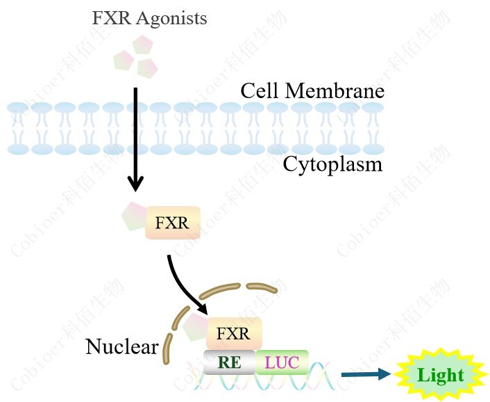 FXR Reporter Cell 報告基因細胞,在由調控因子調控并表達報告基因的 重組細胞上,穩定表達人 FXR。CDCA,GW4064 和 WAY-362450 是 FXR 的激活劑,原理見(jiàn)下圖所示。