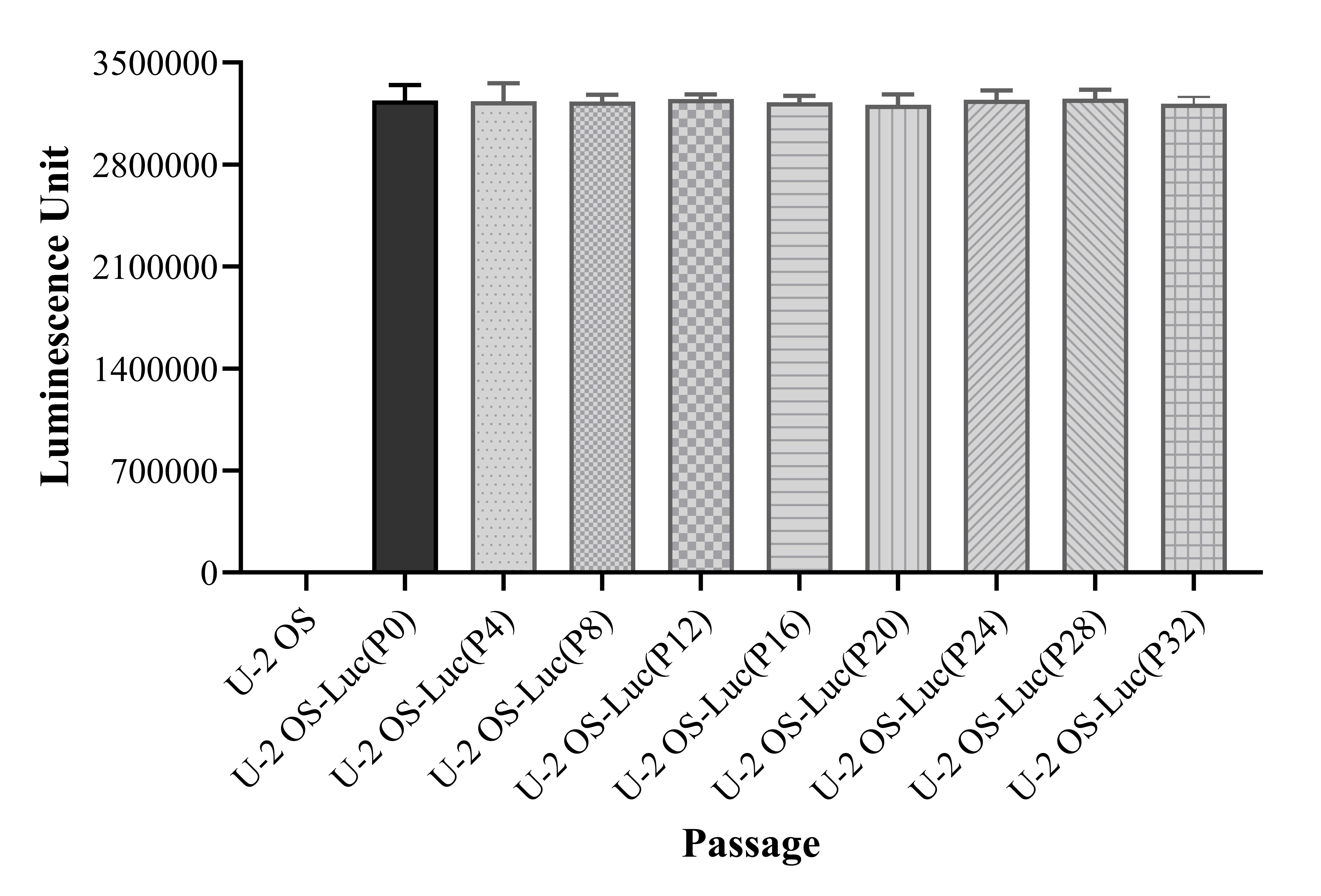 Figure 1. Stablity test results. U-2OS-Luc showed at least 32 passage stability with similar luminescence unit.