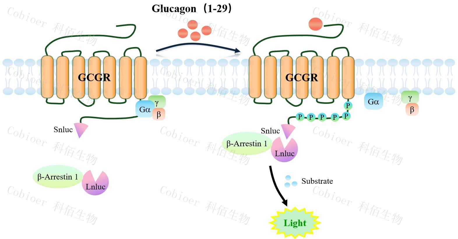 GCGR β-Arrestin 1 CHO 報告基因藥靶模型很好的模擬了體內 GCGR/β-Arrestin 1 的信 號轉導過(guò)程,原理見(jiàn)下圖所示。當缺乏配體刺激時(shí),β-Arrestin 1 不與 GCGR 結合,融合β- Arrestin 1 的熒光素酶處于失活構象;當 GCGR 遭遇配體刺激時(shí),融合熒光素酶報告基因的 β-Arrestin 1 被招募,使熒光素酶報告基因處于激活狀態(tài),加入其底物后發(fā)光信號增強。![]() Figure 1. GCGR β-Arrestin 1 CHO 細胞模型原理圖 |