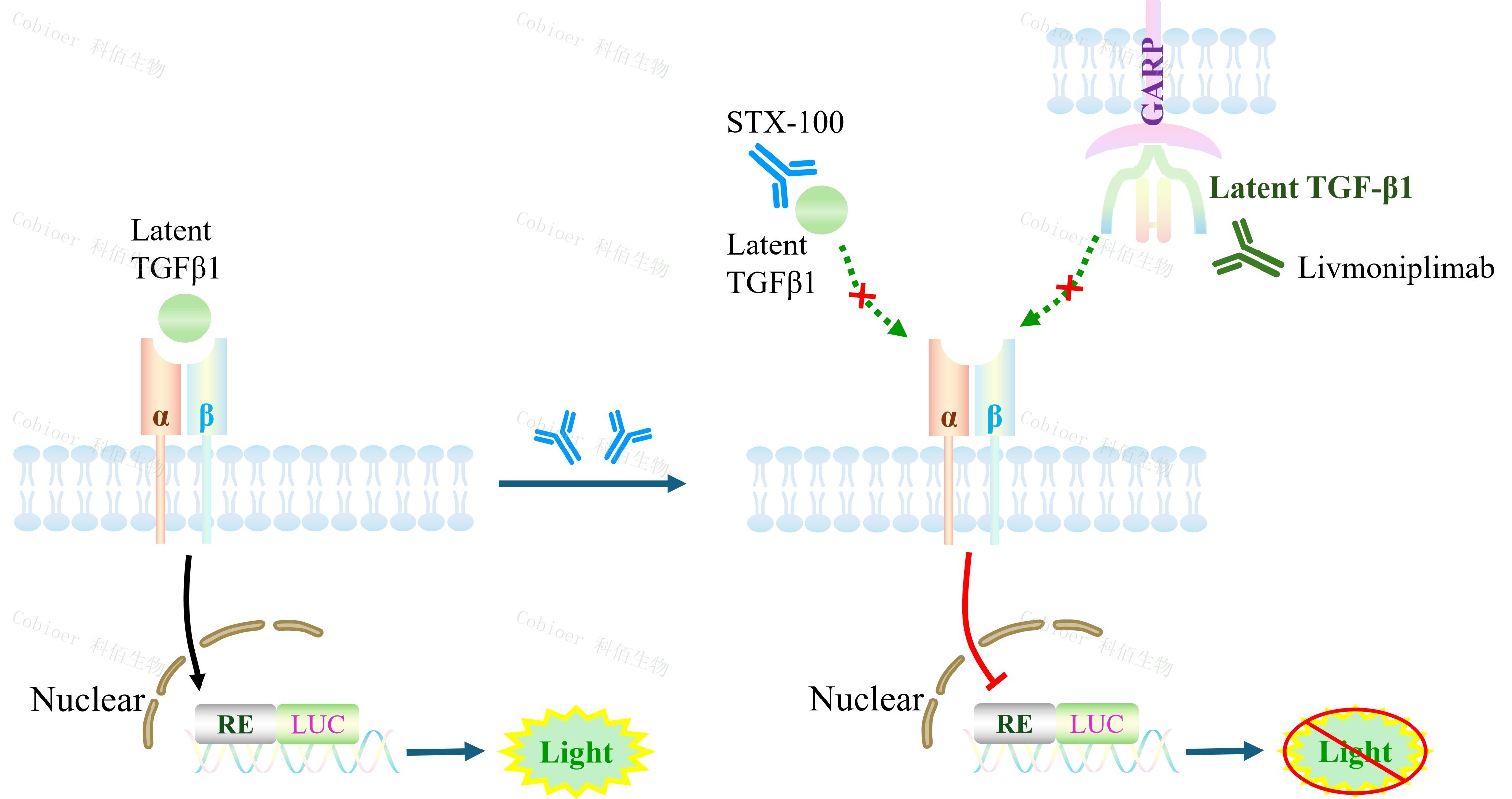Integrin αvβ6 Effector Reporter Cell 報告基因藥靶模型很好的模擬了體內(nèi)αvβ6 的信號轉(zhuǎn) 導(dǎo)過程,原理見下圖所示。