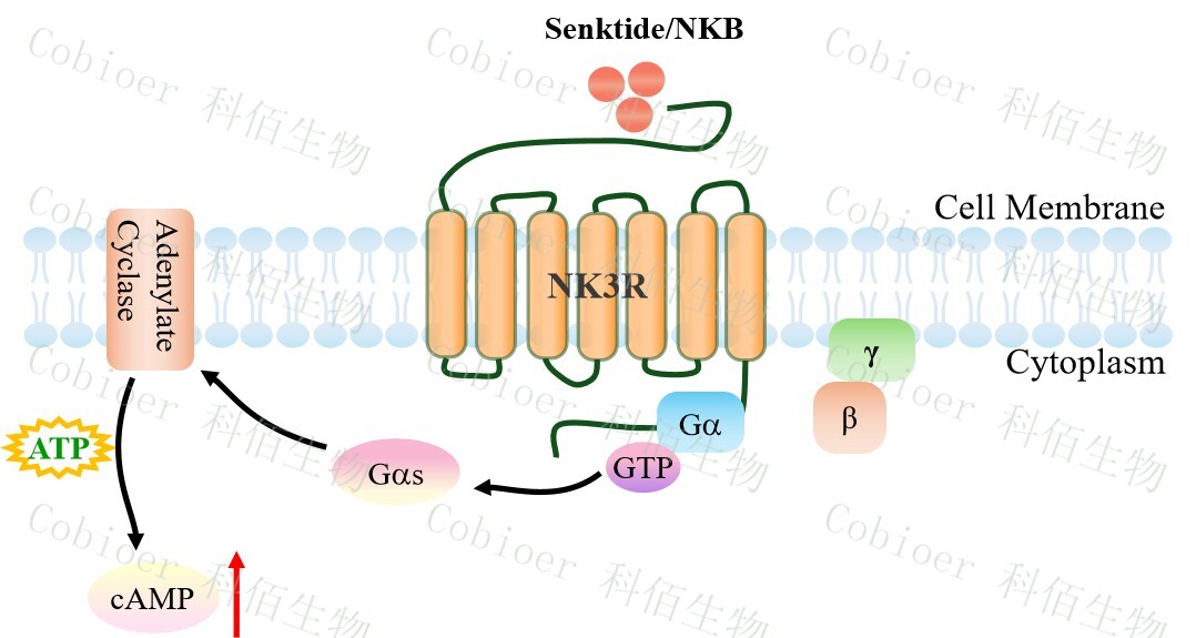 cAMP 在 G 蛋白偶聯(lián)受體(GPCR)信號轉導中是一種關(guān)鍵的第二信使。當配體結合 到 GPCR,構象發(fā)生變化,激活受體接著(zhù)激活 G 蛋白,Gs 的激活導致腺苷酸環(huán)化酶調控 cAMP 的升高。NK3R HEK293 細胞藥靶模型很好的模擬了體內 NK3R 的信號轉導過(guò)程,原 理見(jiàn)下圖所示。