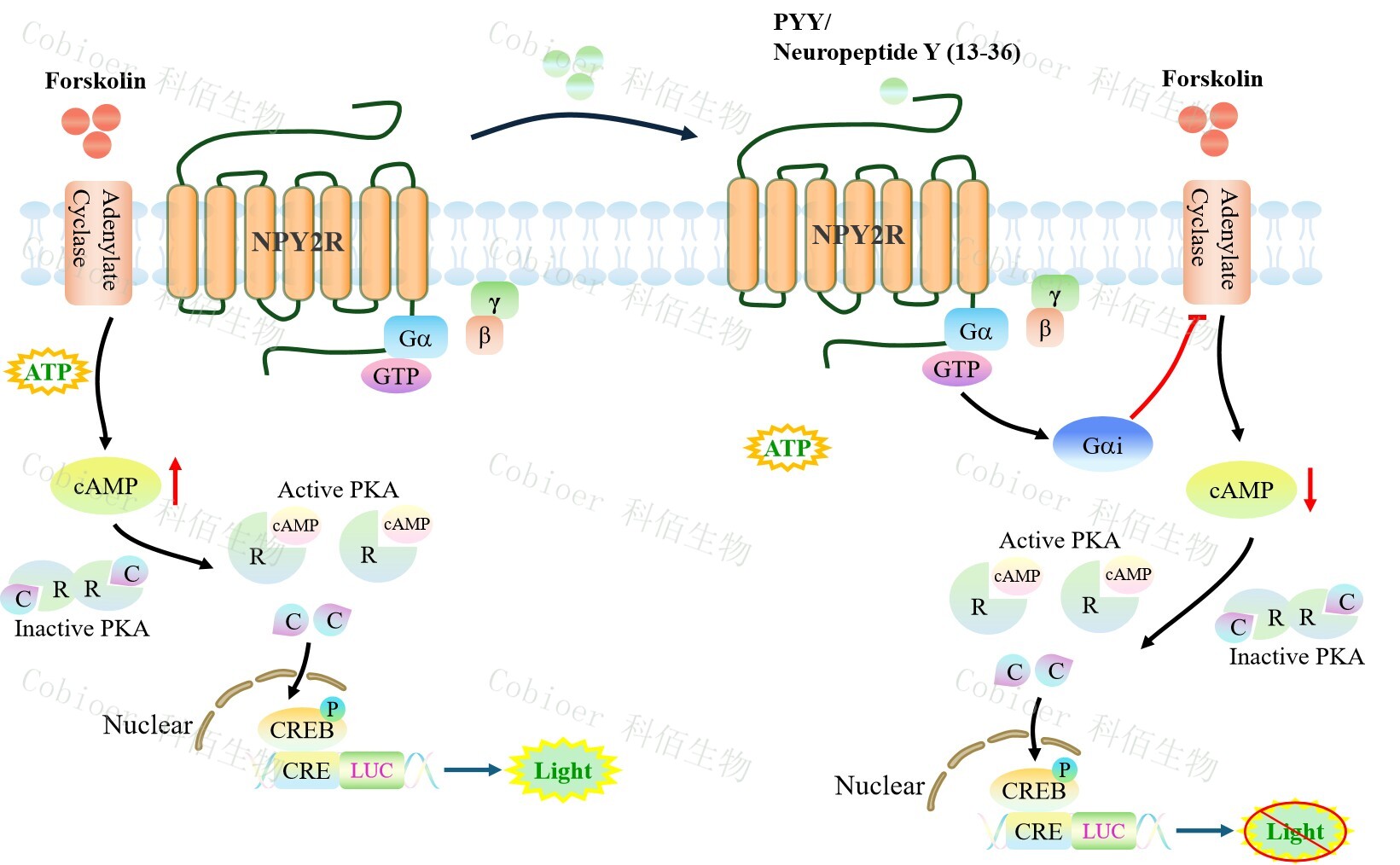 NPY2R CRE-Luc CHO 藥靶模型很好的模擬了體內 NPY2R 的信號轉導過(guò)程,原理見(jiàn)下圖所示。![]() Figure 1. NPY2R CRE-Luc CHO 細胞模型原理圖 |