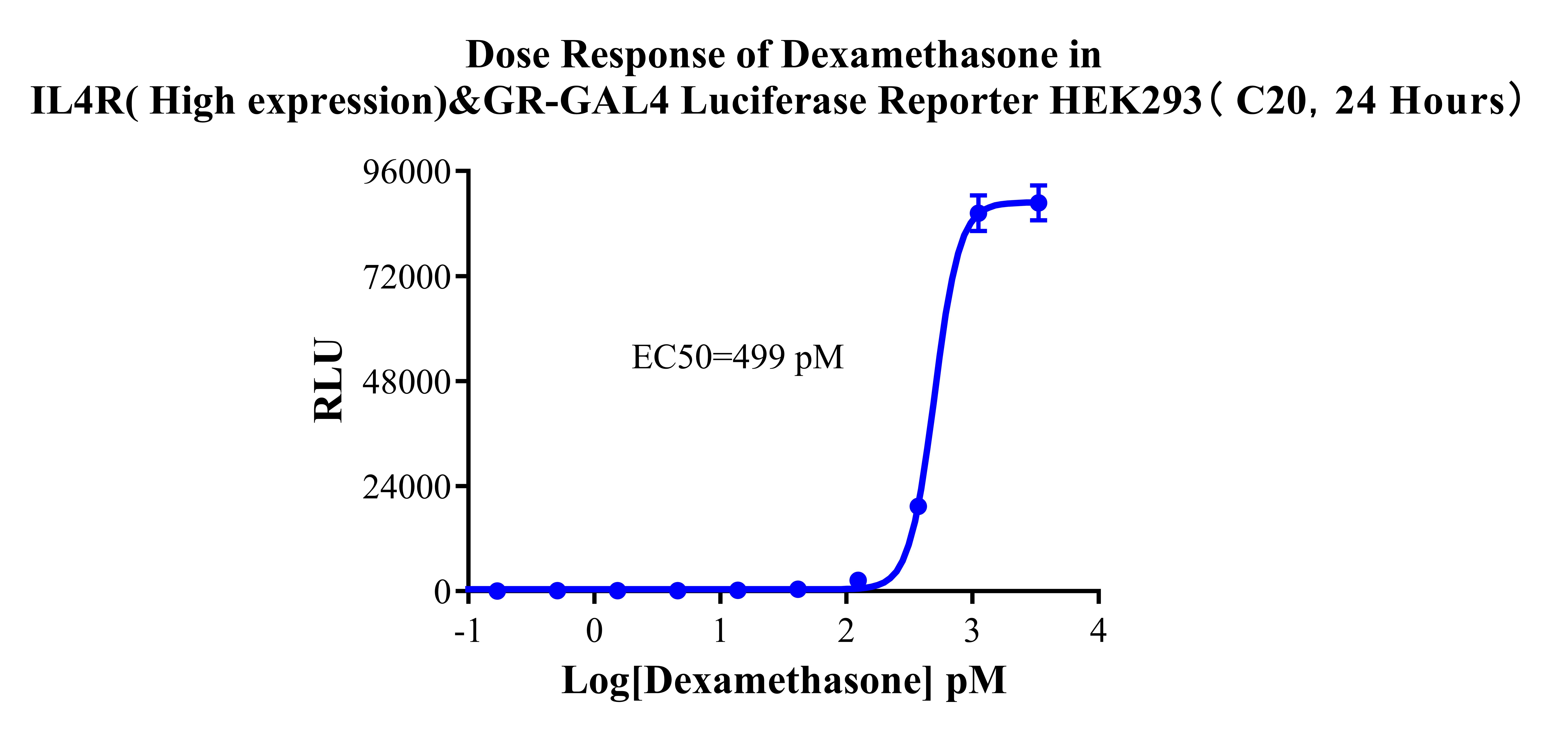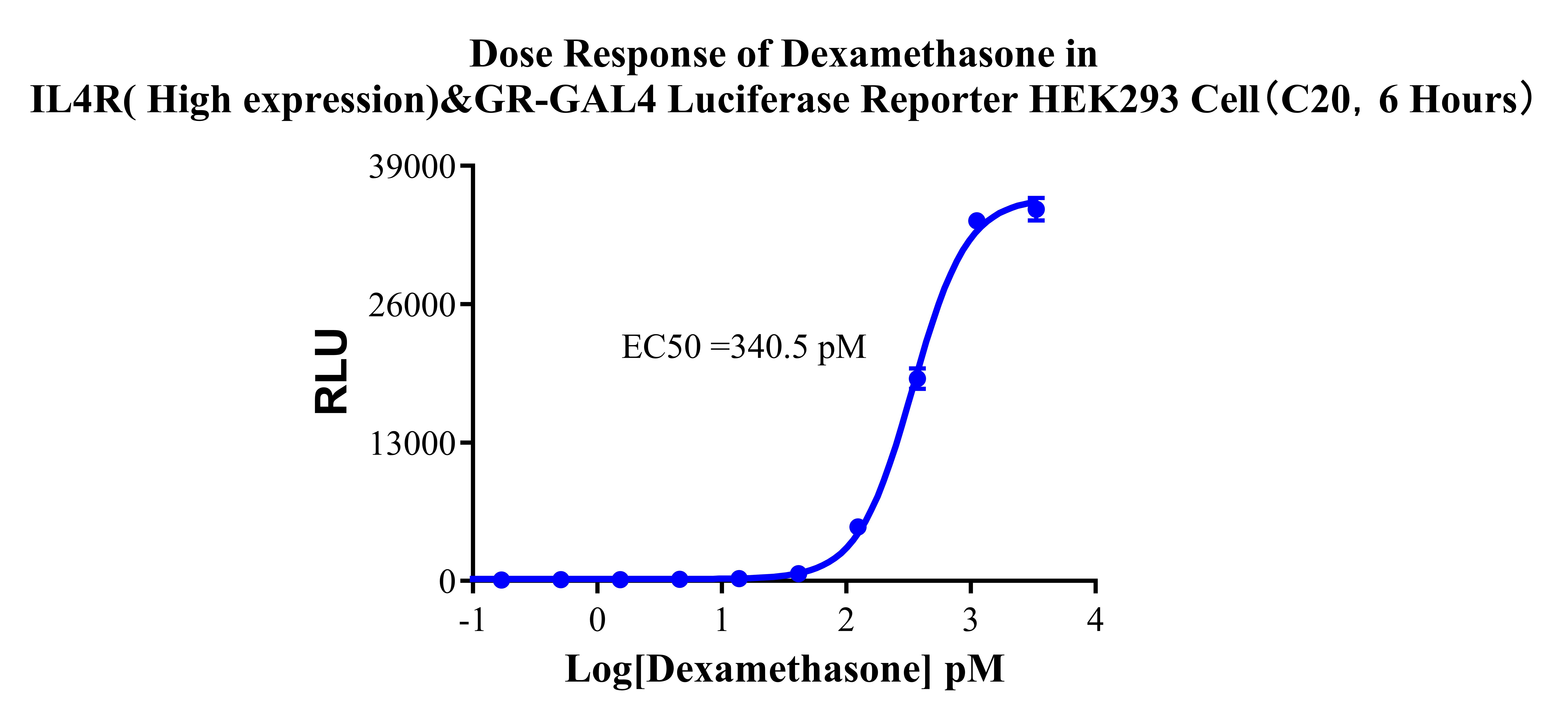 Figure 3. Dose Response of Dexamethasone in IL4R( High expression)&GR-GAL4 Luciferase Reporter HEK293 Cell (C20, 6 Hours). |