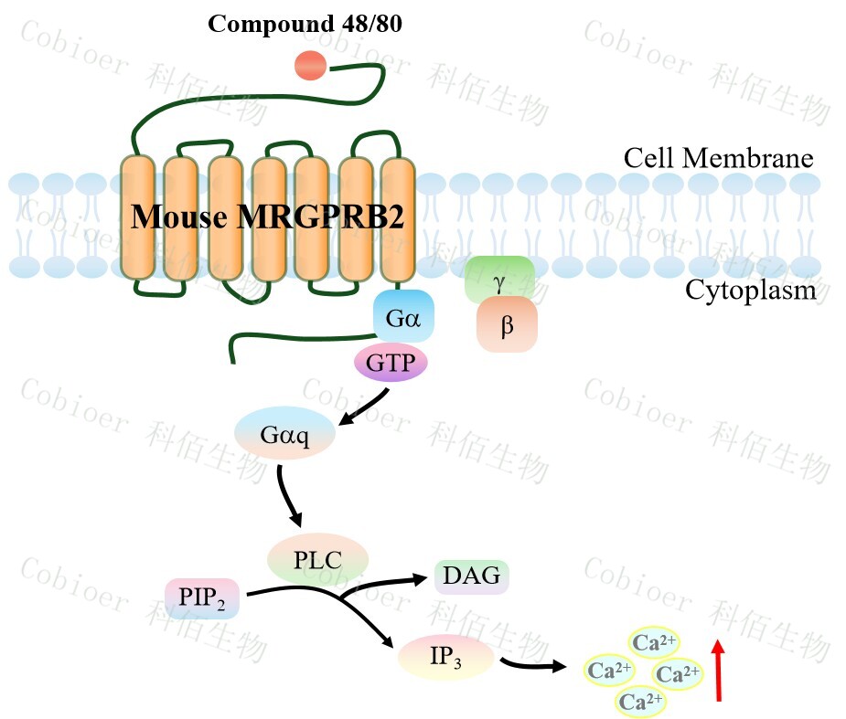 Mouse MRGPRB2 Gα15 HEK293 細胞,在 Gα15 HEK293 細胞上,穩(wěn)定表達鼠的 MRGPRB2。Mouse MRGPRB2 Gα15 HEK293 細胞藥靶模型很好的模擬了體內(nèi) MRGPRB2&Gα15 的信號轉(zhuǎn)導過程,原理見下圖所示。