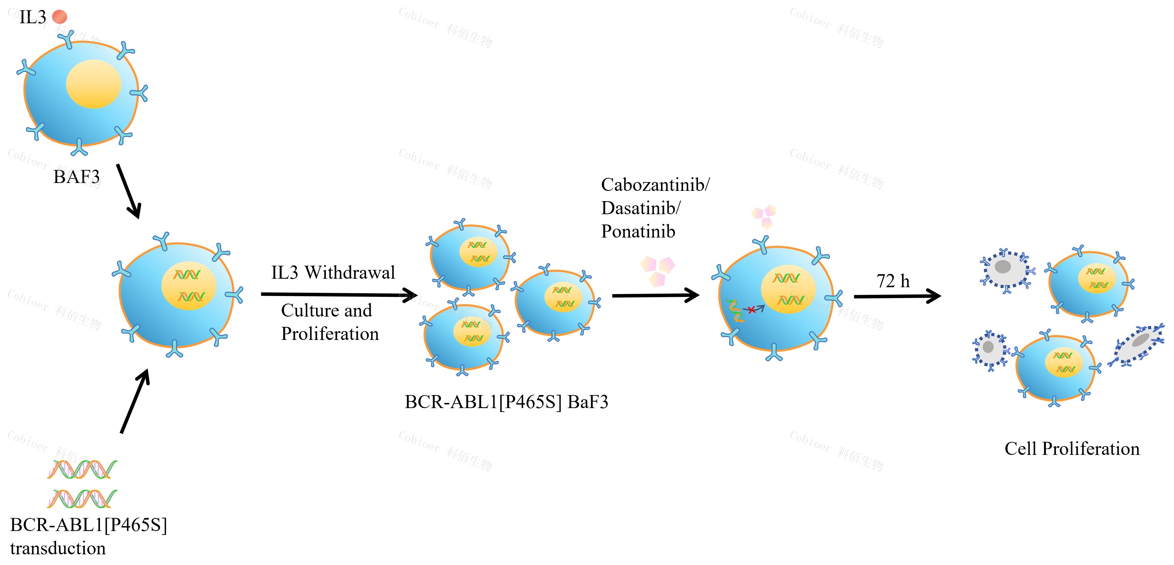 BCR-ABL1[P465S] BaF3 藥靶細(xì)胞 , 通過(guò)轉(zhuǎn)導(dǎo)突變狀態(tài)的 BCR- ABL1[P465S]基因到 BaF3 細(xì)胞系中,穩(wěn)定表達(dá)人突變形態(tài)下的 BCR-ABL1[P465S]基因。