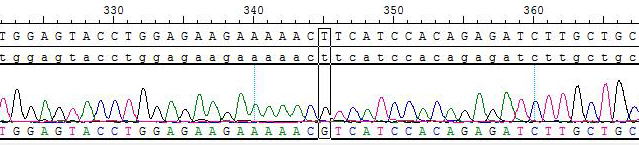 2. Sanger of BCR-ABL1 [F359V/T315I]/BaF3 Figure 2. BCR-ABL1 [F359V/T315I]/BaF3 F359V Figure 3. BCR-ABL1 [F359V/T315I]/BaF3 T315I Figure 4. BCR-ABL1 [F359V/T315I]/BaF3 Fusion |