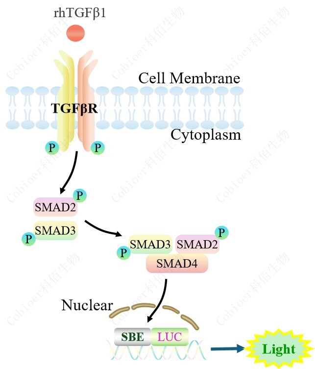 SBE-Luc HEK293 報告基因細胞,是由 SBE 調控并表達 Luc 熒光素酶報 告基因的 HEK293 細胞。TGF-β與受體結合,激活 SBE 的原理見(jiàn)下圖所示。
