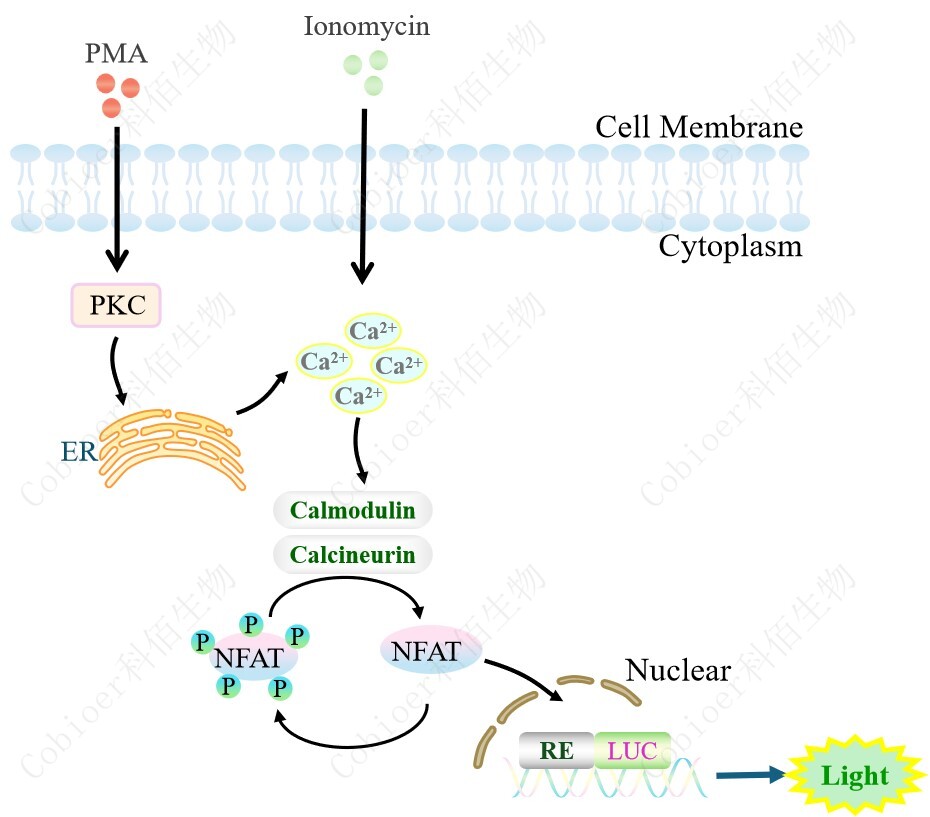 NFAT-Luc HEK293 報告基因藥靶模型很好的模擬了體內 NFAT 的信號轉導過(guò)程,原理見(jiàn)下圖所示。 ![]() Figure 1. NFAT-Luc HEK293 細胞模型原理圖 |
