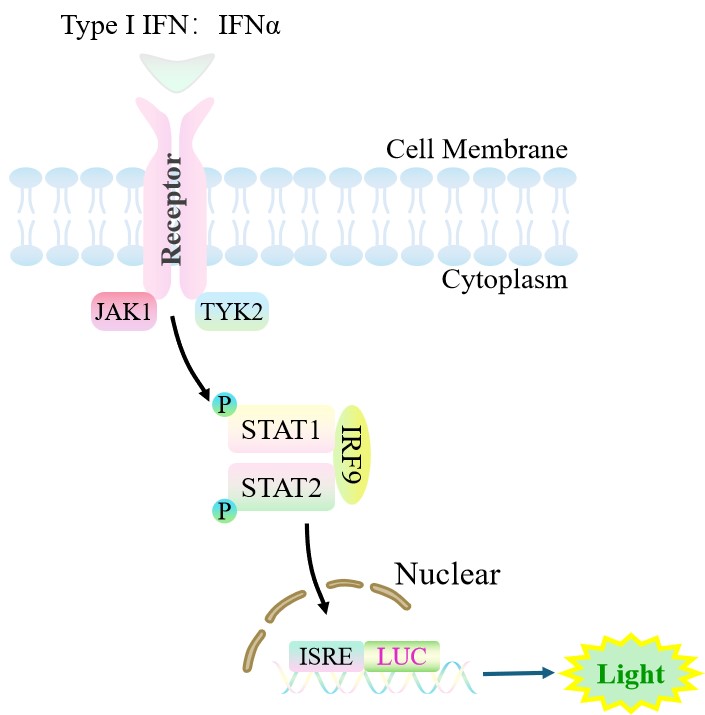 ISRE-Luc HEK293 報告基因細胞是由 ISRE 調控并表達 Luc 熒光素酶 報告基因的 HEK293 細胞。IFN 與受體結合,激活 ISRE 的原理見(jiàn)下圖所示。