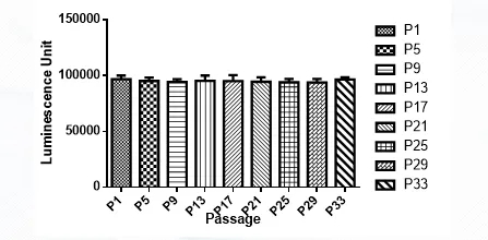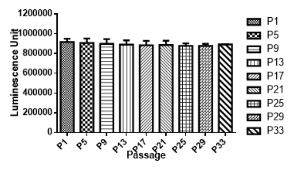 4. 示蹤細胞體外發(fā)光測試,測定發(fā)光信號強度和細胞傳代信號穩定性,確保示蹤細胞在體外和體內都能穩定高水平表達標記蛋白,以科佰生物A549-Luc細胞為例: