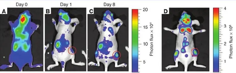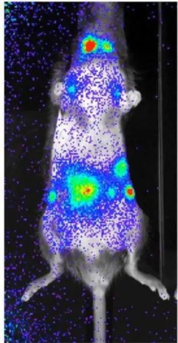 2.腫瘤轉移:由于活體成像技術(shù)直觀(guān)、靈敏度高的特點(diǎn),成為研究腫瘤轉移的重要手段。動(dòng)物體內腫瘤轉移示例: