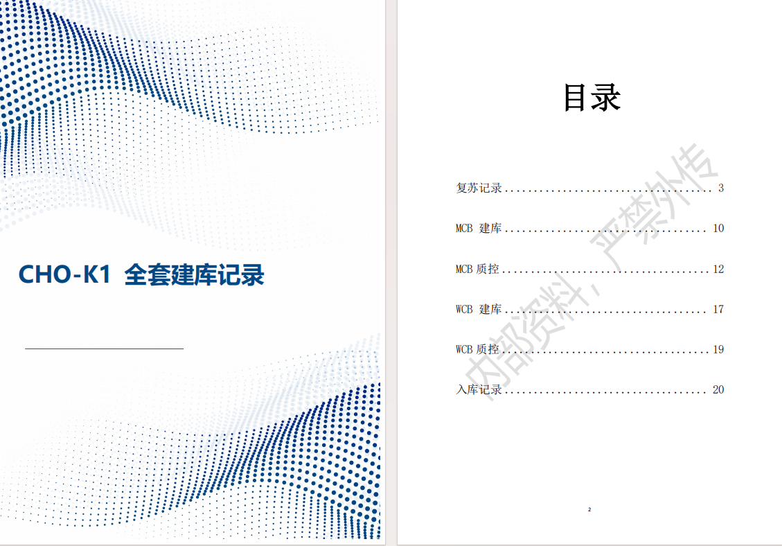 全套建庫記錄:復蘇記錄→MCB建庫→MCB質(zhì)控→WCB建庫→WCB質(zhì)控→入庫記錄,形成從細胞復蘇、主細胞庫(MCB)到工作細胞庫(WCB)的全套建庫操作記錄,保證工藝鏈條完全可追溯與質(zhì)量可控。