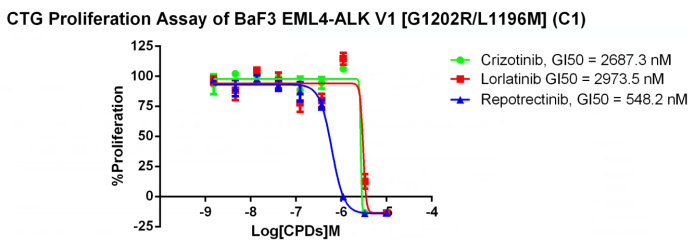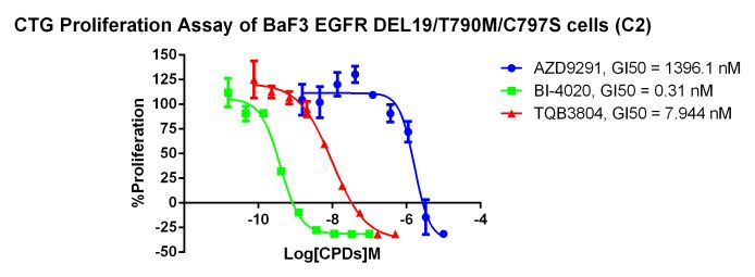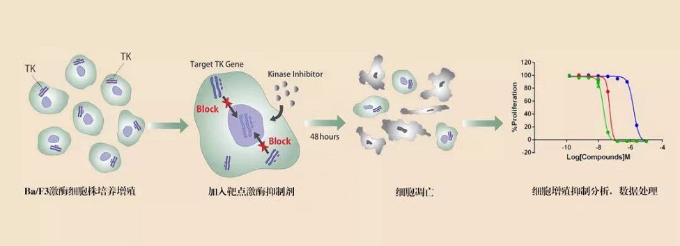 我們結合自己多年在細胞領(lǐng)域的豐富經(jīng)驗,在 Ba/F3(小鼠原B細胞)上進(jìn)行改造,引入相應表達激酶基因,這些基因能作為Ba/F3的驅動(dòng)基因,讓Ba/F3不再依賴(lài)IL-3而增殖,進(jìn)而激酶基因成為Ba/F3增殖依賴(lài)的驅動(dòng)基因,用于評估小分子藥物對激酶的靶向抑制作用。