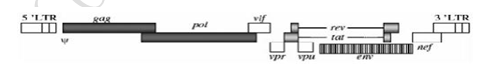 HIV-1為雙鏈RNA病毒,共有9個(gè)基因,如圖1所示。gag、pol、env3個(gè)基因編碼病毒的基本結構,tat、rev為調節基因,vif、vpr、vpu、nef 4個(gè)為輔助基因。其中,gag基因編碼病毒的核心蛋白,包括基質(zhì)蛋白、衣殼蛋白、核衣殼蛋白;pol基因編碼病毒復制所需的酶,如反轉錄酶、整合酶、蛋白酶,env基因編碼病毒的包膜糖蛋白,決定病毒感染宿主的靶向性。rev編碼的蛋白調節gag、pol、env的表達水平,tat編碼的蛋白參與RNA轉錄的控制。4個(gè)輔助基因編碼的蛋白則作為毒力因子參與宿主細胞的識別和感染。兩端為長(cháng)末端重復序列(LTR),內含復制所需的順式作用元件,如包裝信號元件Ψ。