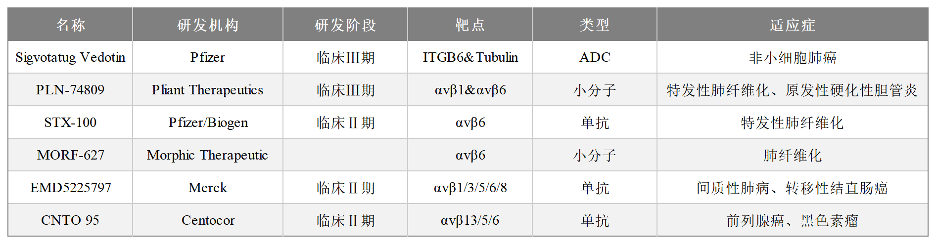 2025年JPM大會(huì )上,Pfizer 公布其Sigvotatug Vedotin(SGN-B6A)在非小細胞肺癌患者中良好的抗腫瘤活性和初步的療效,特別是在未接受過(guò)紫杉烷治療的非鱗狀NSCLC患者中,其療效更為顯著(zhù)。整合素αvβ6作為纖維化和腫瘤治療的潛力靶點(diǎn),近年來(lái)藥物研發(fā)進(jìn)展迅速,涵蓋單抗、小分子、ADC及基因療法等領(lǐng)域。