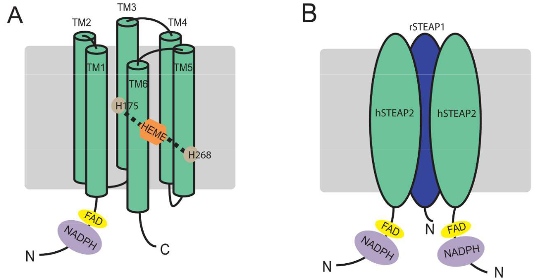 STEAP1、STEAP2均 屬于 STEAP (six-transmembrane epithelial antigen of prostate) 蛋白家族,具有六個(gè)跨膜結構域、細胞質(zhì)N端的多跨膜蛋白。其中STEAP1的編碼基因由 339 個(gè)氨基酸組成,位于 7q21.13 染色體上。STEAP1的 N 端胞質(zhì)結構域與 STEAP 蛋白家族的其他成員不同,不具有類(lèi)似于 NADP+氧化還原酶(FNO)結構域的特征。因此,STEAP1不能獨立表現出Fe3+和 Cu2+的還原活性。
