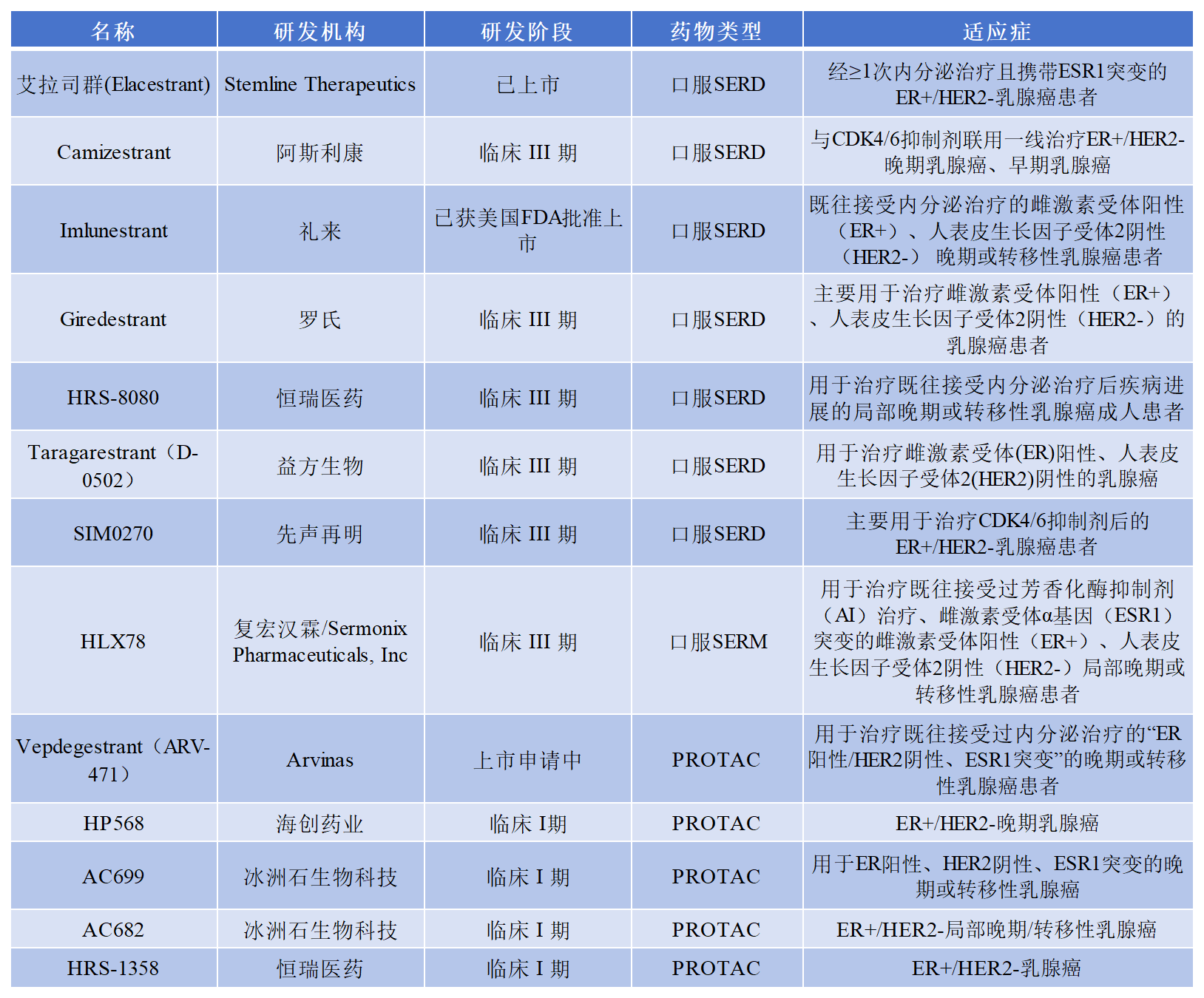 從他莫昔芬、芳香化酶抑制劑到氟維司群,傳統療法逐漸暴露出耐藥性、注射給藥不便等局限性。新一代口服選擇性雌激素受體降解劑(SERD)以創(chuàng )新作用機制和口服優(yōu)勢,有望重塑HR+/HER2-乳腺癌的治療格局。另外,還有降解 ER的PROTAC等藥物在研發(fā)中。以下為部分已上市或處于臨床階段的藥物信息: