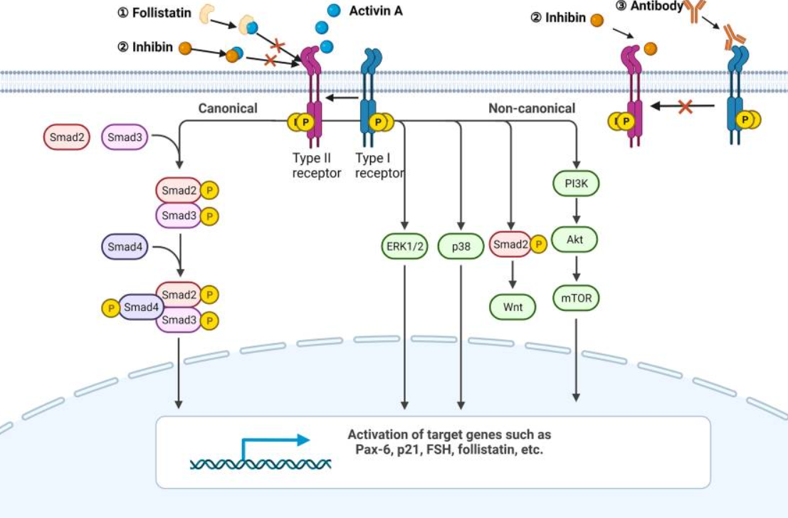 激活素A首先結合并促進(jìn)ActRII的磷酸化,然后招募I型受體形成磷酸化多聚體。激活的受體復合物磷酸化SMAD2 和 SMAD3蛋白,磷酸化后的smad2/3與smad4蛋白結合成三聚體并易位到細胞核中調控相關(guān)基因的轉錄。