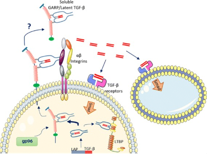 LTGF-β 是前體 TGF-β(pro-TGF-β)與潛伏相關(guān)肽(LAP)形成的復(fù)合物,TGF-β以無活性的同源二聚體前體蛋白形式合成,經(jīng)由類似于弗林蛋白酶的蛋白酶切割后形成LTGF-β 。GARP 能增強弗林蛋白酶依賴性切割,并與LTGF-β 結(jié)合。內(nèi)質(zhì)網(wǎng)腔內(nèi)的主要伴侶蛋白 gp96 確保 GARP 的正確折疊及其在細胞表面的表達。在細胞表面,GARP/LTGF-β復(fù)合物與α-β整合素(αVβ6 和αVβ8)結(jié)合,釋放成熟的 TGF-β 肽。成熟的 TGF-β 以自分泌和旁分泌的方式與細胞表面的 TGF-β 受體相互作用。在某些情況下,GARP/LTGF-β復(fù)合物也可以從細胞表面釋放,但如何從可溶性復(fù)合物中激活 TGF-β 尚不清楚。