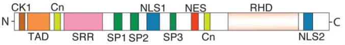 在人類中,NFAT家族由五個不同的基因產物組成,命名如下:NFAT1(也稱為NFATc2和NFATp);NFAT2(也稱為NFATc1和NFATc);NFAT3(也稱為NFATc4);NFAT4(也稱為NFATc3和NFATx)和NFAT5(也稱為TonEBP和OREBP)。鈣調控的經典NFAT蛋白(NFAT 1-4)由多個功能模塊組成,這些模塊決定了蛋白質的磷酸化、核內定位、DNA結合以及目標基因的轉活化。N端區(qū)域包含調控結構域,包括酪蛋白激酶1(CK1)對接位點、轉活化結構域(TAD)和鈣煜氨酸(Cn)對接位點。C端包含DNA結合的Rel同源結構域(RHD)和一個額外的鈣化神經素對接位點。蛋白質中間有幾個富含絲氨酸的結構域(SRR、SP1-3),為靶向NFAT的激酶提供磷酸化位點。此外,NFAT蛋白包含兩個調控其亞細胞定位的信號序列:核定位信號序列(NLS1和NLS2)和核輸出信號(NES)。與經典的NFATc蛋白不同,NFAT5(也稱為強張增強蛋白結合蛋白)不依賴鈣神經素或核伴侶即可發(fā)揮活性。