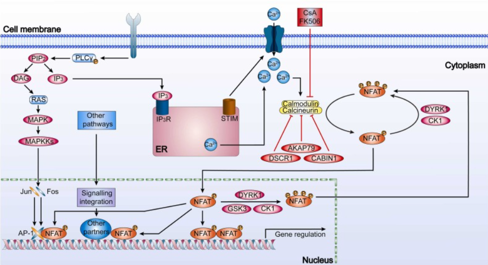 當NFAT蛋白在SRR和SP區(qū)域的絲氨酸殘基上被強烈磷酸化時,這些蛋白被限制在細胞質中。細胞表面受體如T細胞受體(TCR)、受體酪氨酸激酶(RTKs)和G蛋白偶聯(lián)受體(GPCRs)的激活,引發(fā)信號級聯(lián)反應。磷脂酶C(PLC)被激活?;罨疨LC催化了磷脂酰肌醇-4,5-雙膦酸鹽(PIP2)的水解,生成哧啶醇-1,4,5-三磷酸(IP3)和二酰甘油(DAG)。IP3與內質網表面的IP3R結合,導致內質網向細胞質短暫的鈣離子流出,短暫地提高細胞質中的鈣水平,但減少內質網的鈣儲備。儲備鈣的消耗導致內質網上的鈣感應器STIM形成寡聚體,并遷移至內質網-質膜連接處,在那里它們結合并激活質膜上的Orai(CRAC通道)。Orai形成四聚體通道,開啟持續(xù)的低振蕩性鈣流入,與細胞質中的鈣傳感器鈣調素(CAM)結合,形成鈣/鈣調蛋白/鈣神經素復合物,激活鈣神經素。鈣化神經素具有催化基(CnA)和調控亞基(CnB)?;罨腃nA脫磷酸化NFAT蛋白并揭露其NLSs,從而實現(xiàn)核易位。