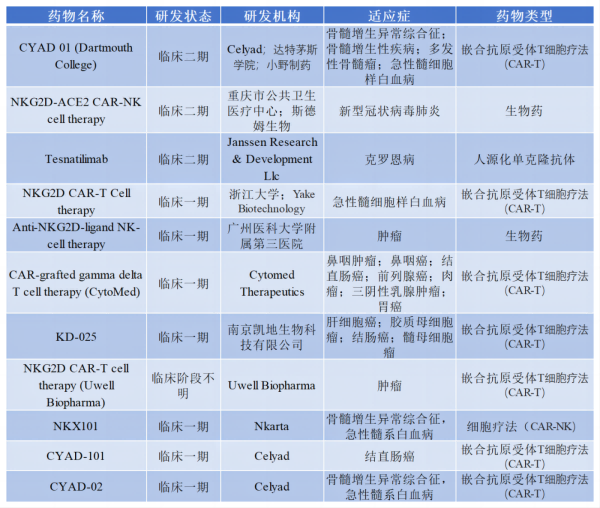 截至目前,全球有11種針對NKG2D的在研藥物,主要集中在臨床早期,其中以CAR-T細胞療法為作用機制的就有10種。而CAR-NK療法因為沒(méi)有發(fā)現細胞因子釋放綜合癥及神經(jīng)毒性等副作用,因而比CAR-T療法具有優(yōu)勢,這可能是由于NK細胞本身不容易導致過(guò)高的細胞因子分泌。除此之外CAR-NK療法不需要以患者的自體免疫細胞作為來(lái)源、治療成本更低等優(yōu)勢可能使它成為CAR-T療法的一大競爭對手。除抗腫瘤藥物外,強生旗下的楊森公司針對該靶點(diǎn)在自身免疫疾病方面的作用開(kāi)發(fā)了一款單抗類(lèi)藥物,通過(guò)抑制該靶點(diǎn)活性來(lái)降低克羅恩病患者的炎癥反應。